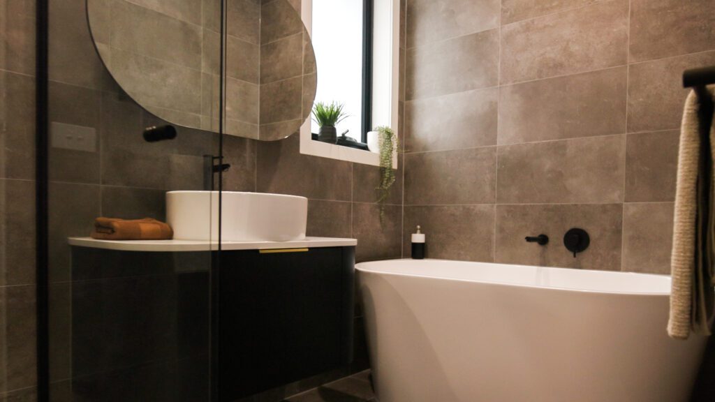 Bathrooms are fitted with Phoenix black tapware, semi-frameless shower screens with swing doors, and Bondi mirror shaving cabinets. The main bathroom features a luxurious freestanding back-to-wall bath, complemented by floor-to-ceiling Portland Grey matt porcelain tiles. Hybrid timber flooring in a latte color is installed throughout the main areas, while Category 3 pull-and-twist pile grey carpet with 11mm foam underlay adds comfort to the bedrooms. Sheer curtains adorn the open living area, with two-system manual block-out roller blinds on all windows for privacy and light control.